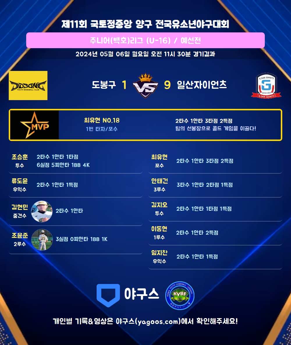 | 일산자이언츠 | 1 | 5 | 0 | 3 | 9 | 5 | 1 | 8 |
