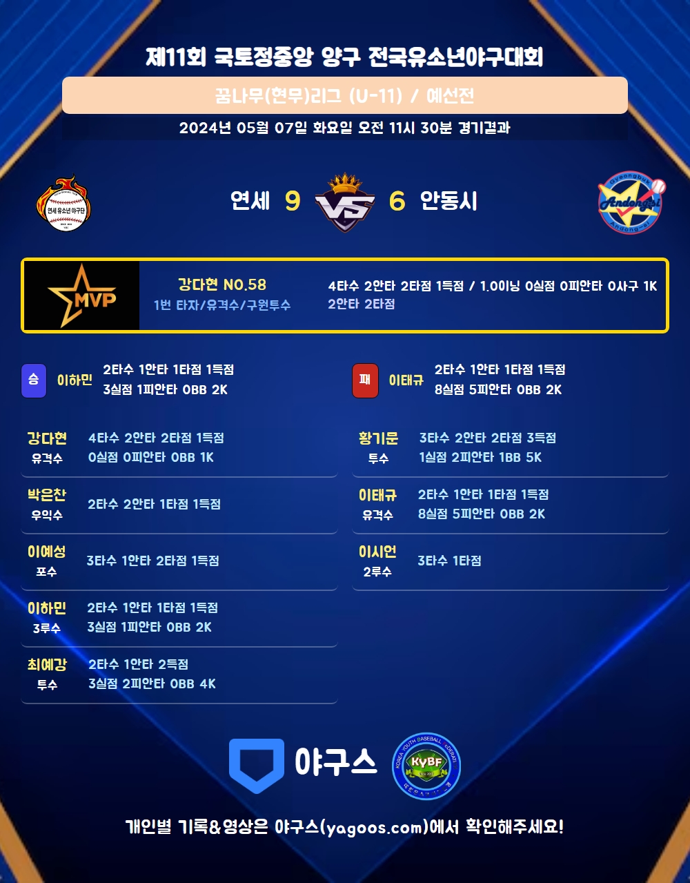 | 1 | 유 | 강다현(58) | 삼진 | - | 유내안 | 2내안 | 1땅병 | 4 | 2 | 2 | 1 | 0 | 3 | - | 1 | 0.500 |