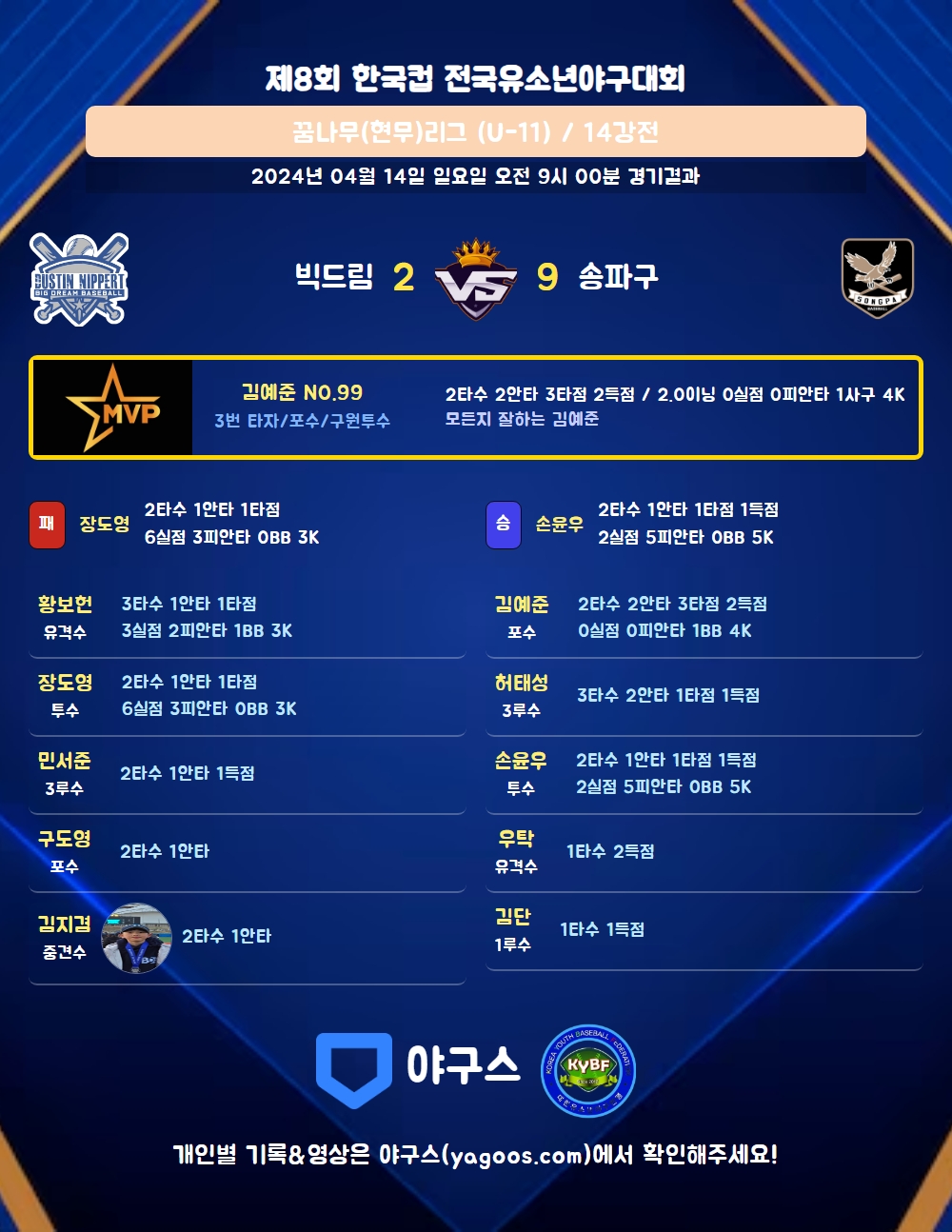 | 3 | 포 | 김예준(99) | 좌중2 | 우월안 | 고의4구 | - | - | 2 | 2 | 3 | 2 | 0 | 2 | 1 | 0 | 1.000 |