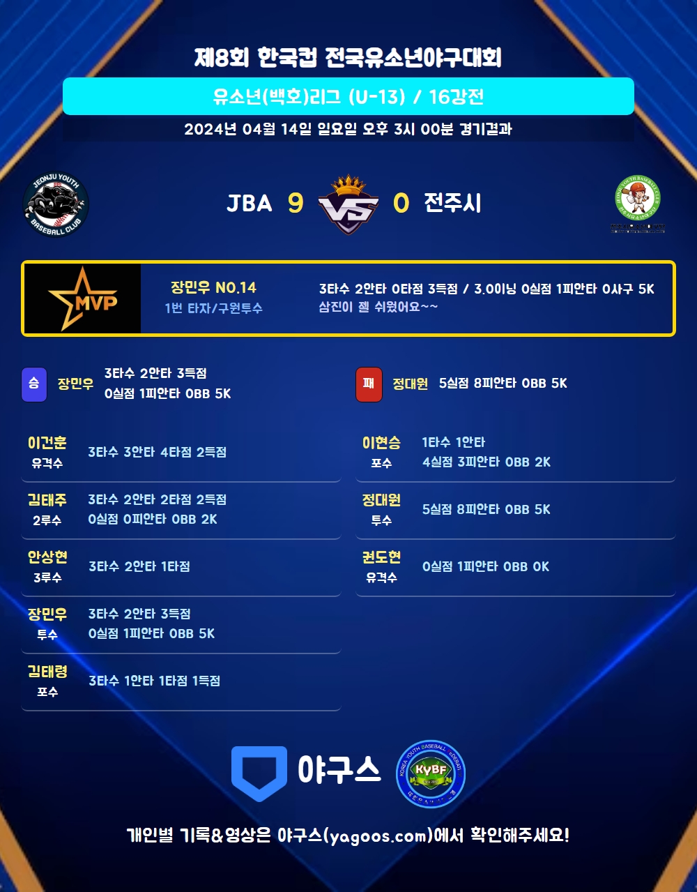 | 2 | 장민우(14) | 승 | - | 9 | 1 | 1 | 0 | - | 5 | 34 | 0 | 0 | 0.00 |