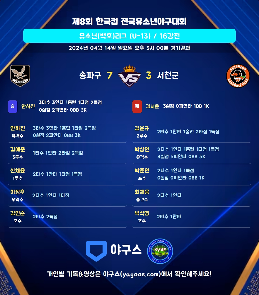 | 8 | 우 | 유준서(14) | - | 삼진 | - | 4구 | 1 | 0 | 0 | 0 | 0 | 0 | 1 | 1 | 0.000 |