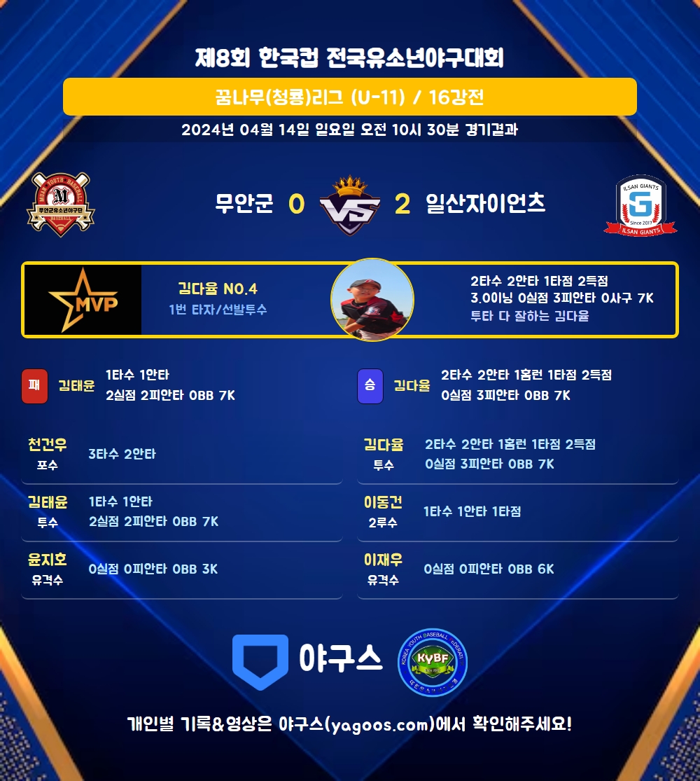 | 일산자이언츠 | 1 | 0 | 1 | 0 | 0 | 2 | 3 | 0 | 1 |
