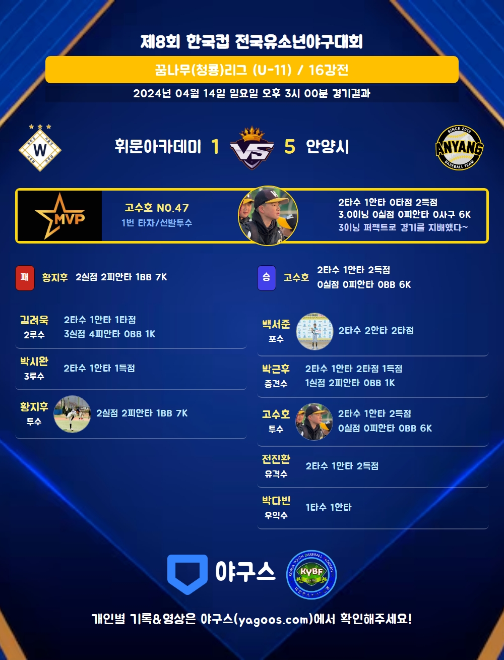 | 1 | 투 | 고수호(47) | 1땅 | - | 4구 | 유내안 | - | 2 | 1 | 0 | 2 | 0 | 4 | 1 | 0 | 0.500 |
