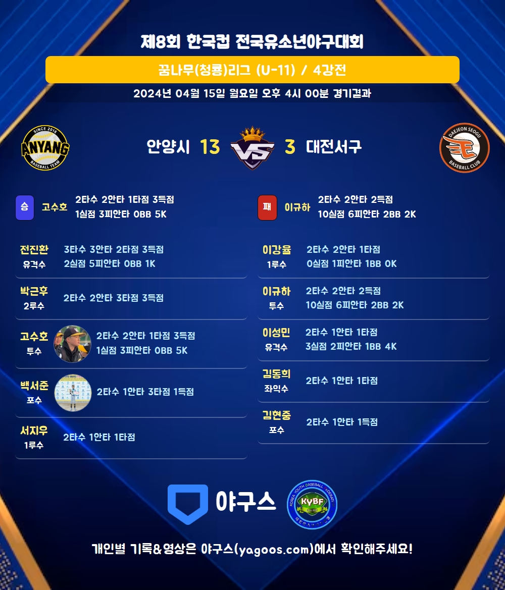 | 1 | 고수호(47) | 승 | - | 9 | 3 | 3 | 0 | - | 5 | 29 | 1 | 1 | 250.00 |