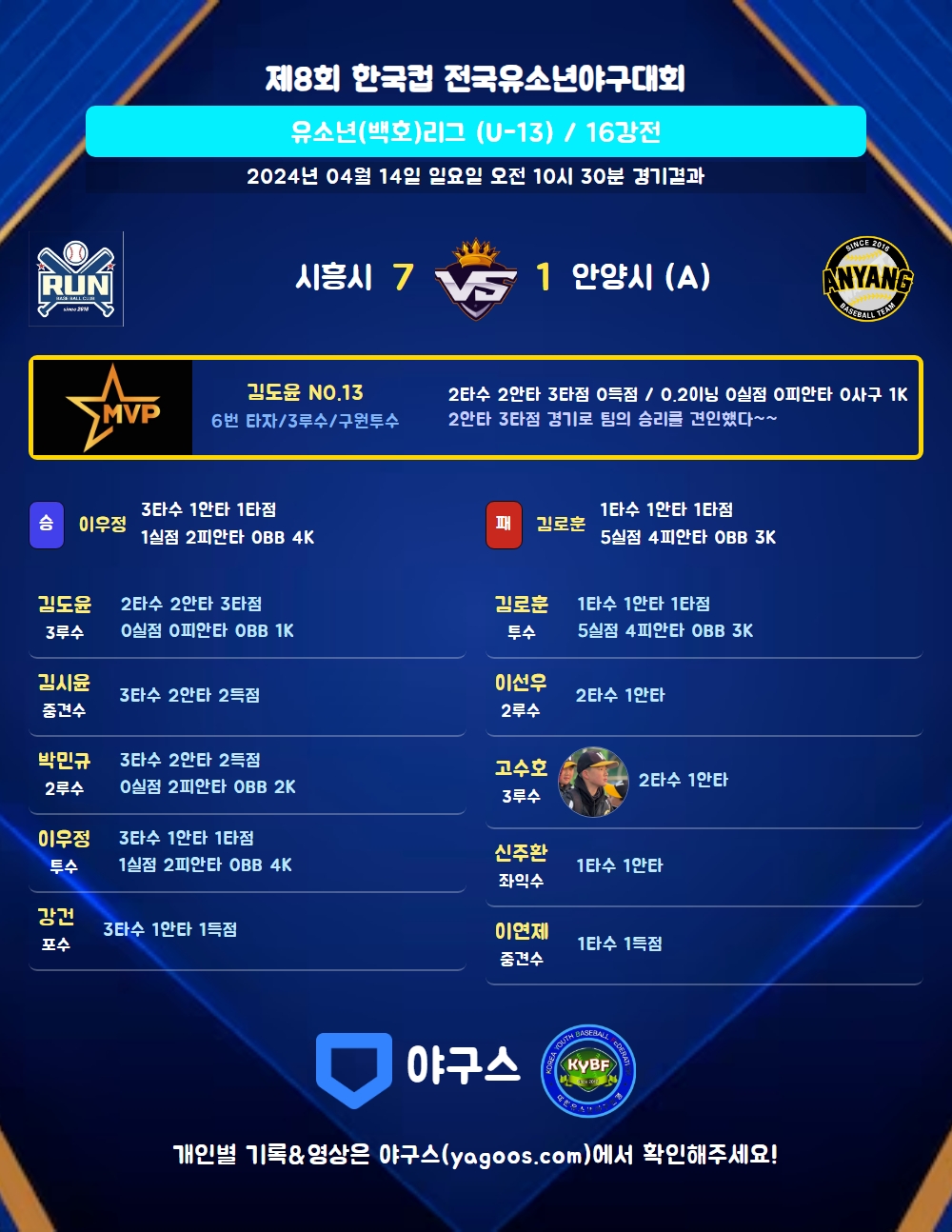 | 8 | 우 | 김유수(16) | - | 유플 | 3직 | - | 우플 | - | 3 | 0 | 0 | 0 | 0 | 0 | - | 0 | 0.000 |