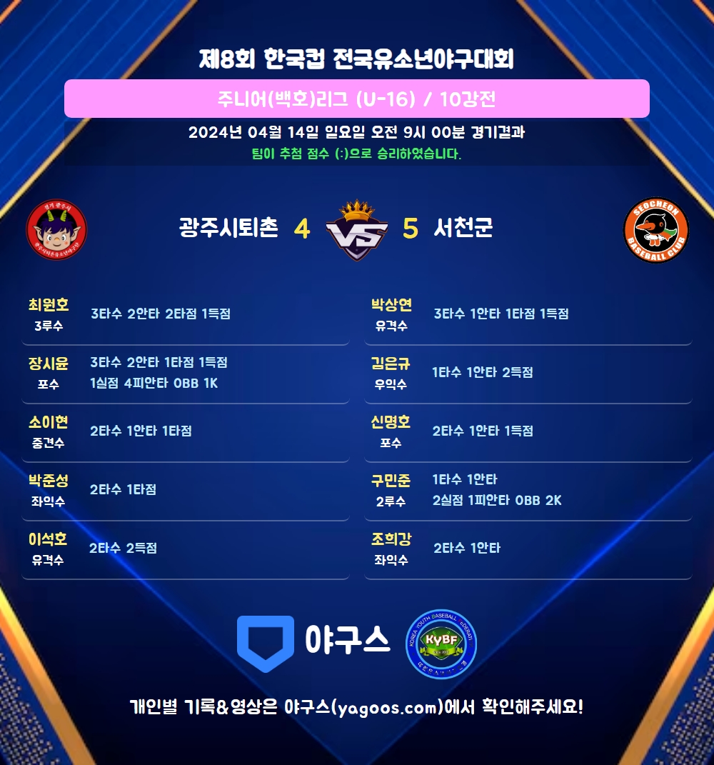 | 1 | 유 | 박상연(21) | 유땅 | 2야선 | - | 중전안 | 3 | 1 | 1 | 1 | 0 | 1 | - | 0 | 0.333 |
