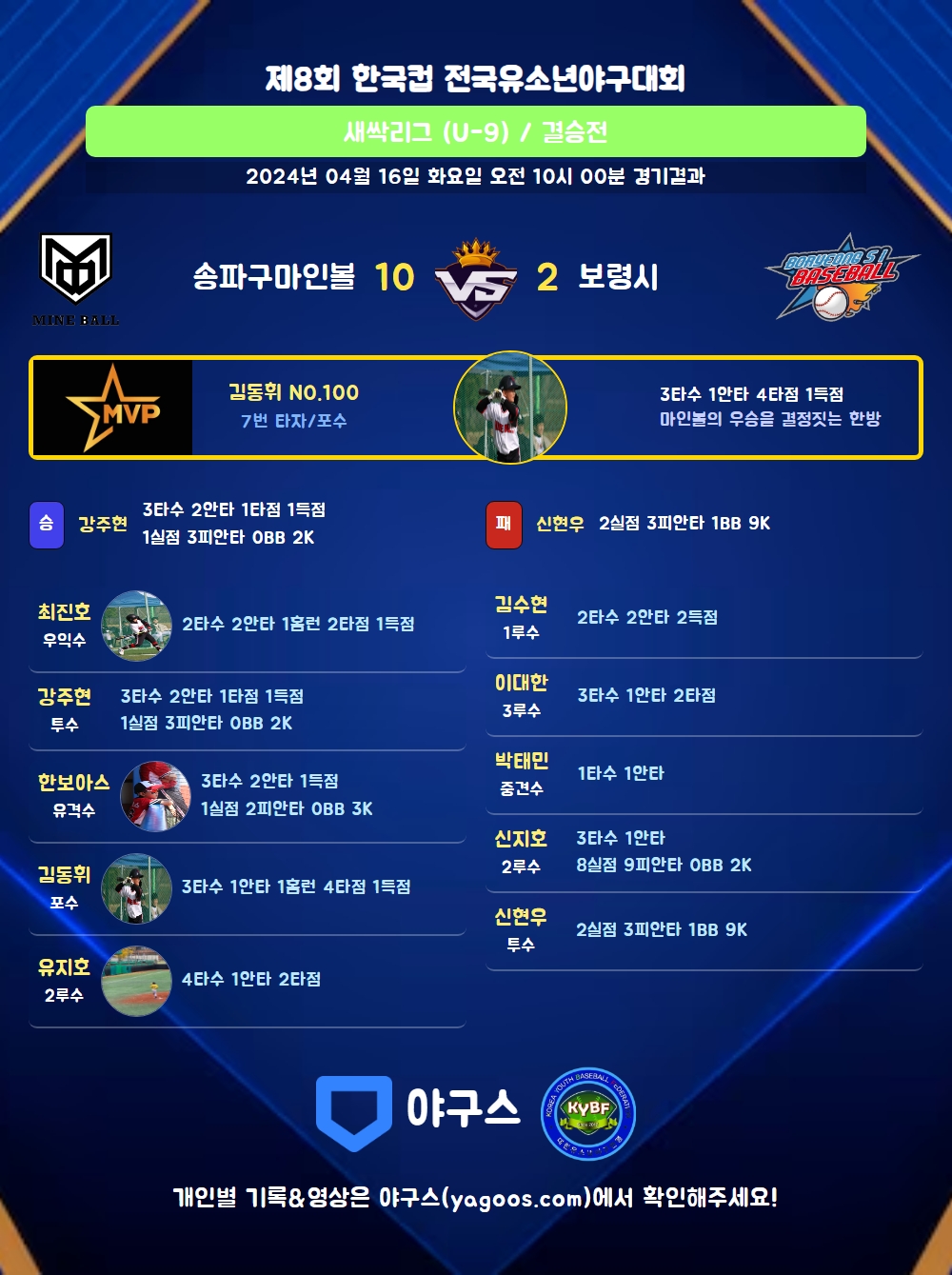 | 2 | 二 | 신지호(9) | 투땅 | - | 삼진 | 3내안 | - | - | 3 | 1 | 0 | 0 | 0 | 0 | - | 1 | 0.333 |