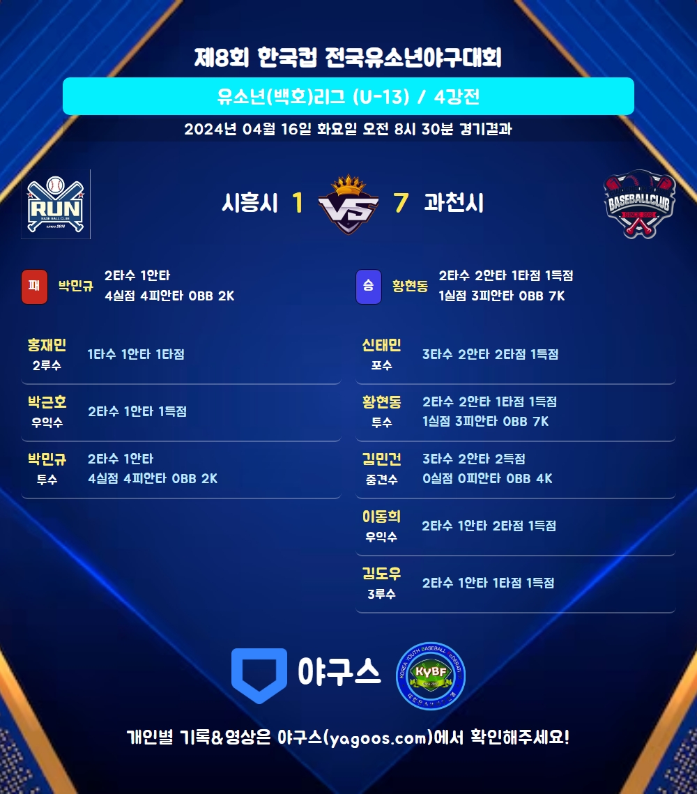 | 8 | 좌 | 김유수(16) | - | 삼진 | - | 1땅 | - | 2 | 0 | 0 | 0 | 0 | 0 | - | 1 | 0.000 |