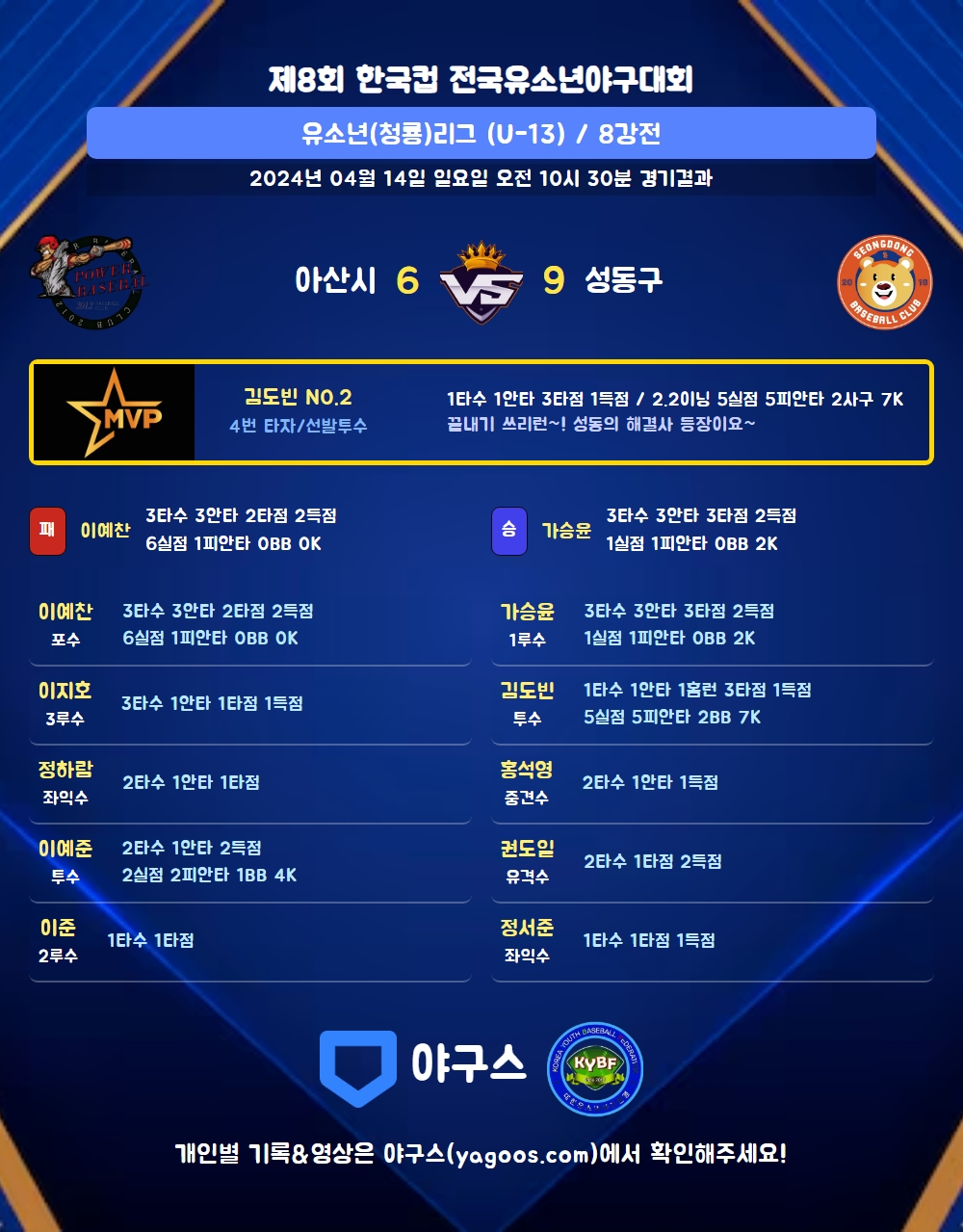 | 1 | 투 | 이예준(9) | 삼진 | - | 3내안 | 4구 | 2 | 1 | 0 | 2 | 0 | 1 | 1 | 1 | 0.500 |