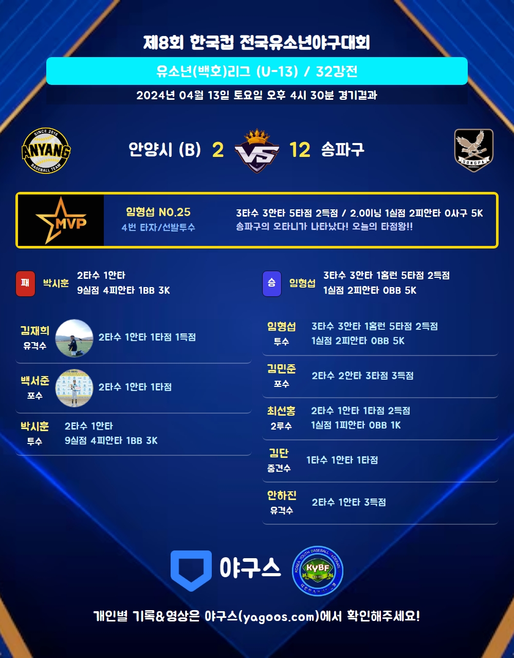 | 4 | 포 | 백서준(18) | 중전안 | - | 투땅 | 2 | 1 | 1 | 0 | 0 | 0 | - | 0 | 0.500 |