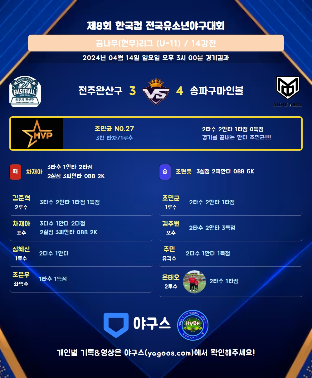 | 2 | 포 | 차재아(25) | 2땅 | - | 2땅 | - | 우전안 | 3 | 1 | 2 | 0 | 0 | 2 | - | 0 | 0.333 |