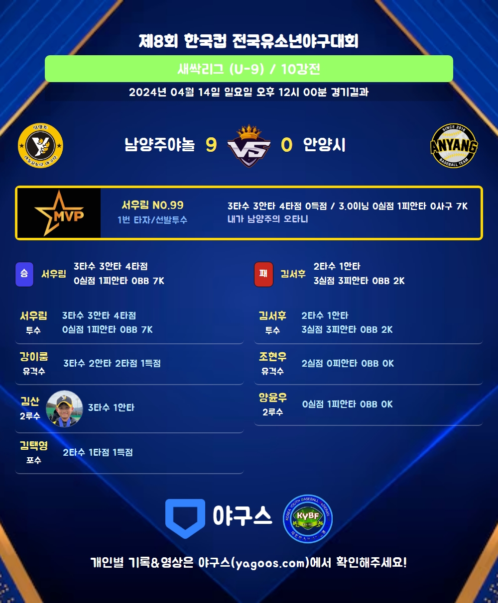| 1 | 투 | 김서후(44) | 유내안 | - | 삼진 | - | 2 | 1 | 0 | 0 | 0 | 0 | - | 1 | 0.500 |