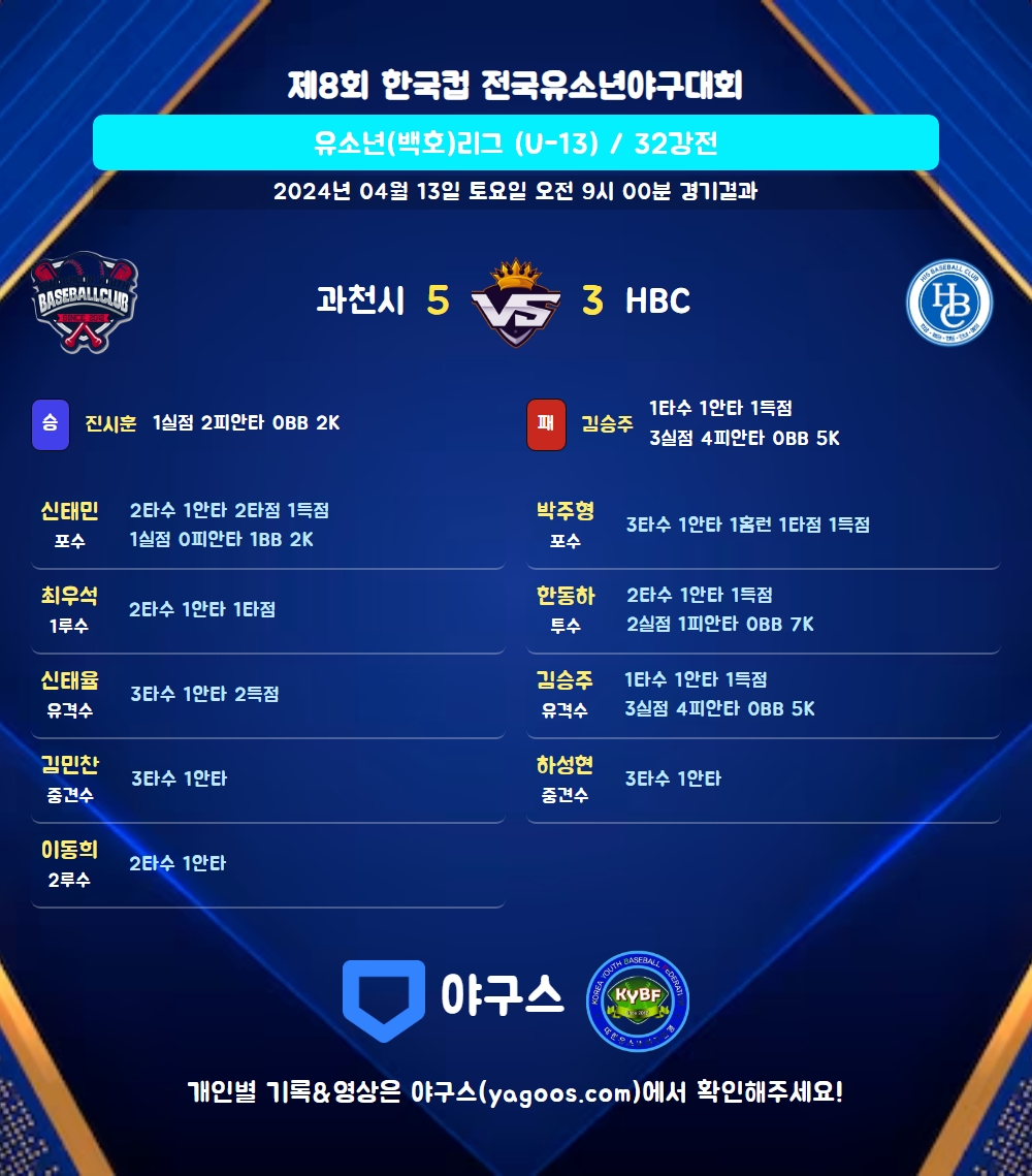 | 팀명 | 1회 | 2회 | 3회 | 4회 | 5회 | R | H | E | B | L |