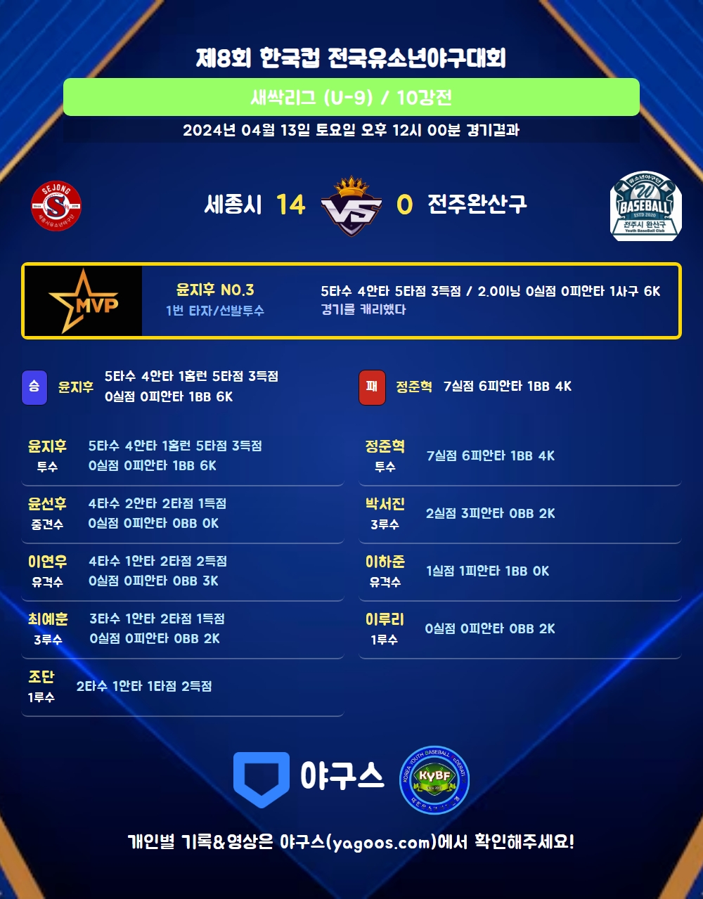 | 1 | 윤지후(3) | 승 | - | 7 | 0 | 0 | 0 | 1 | 6 | 35 | 0 | 0 | 0.00 |