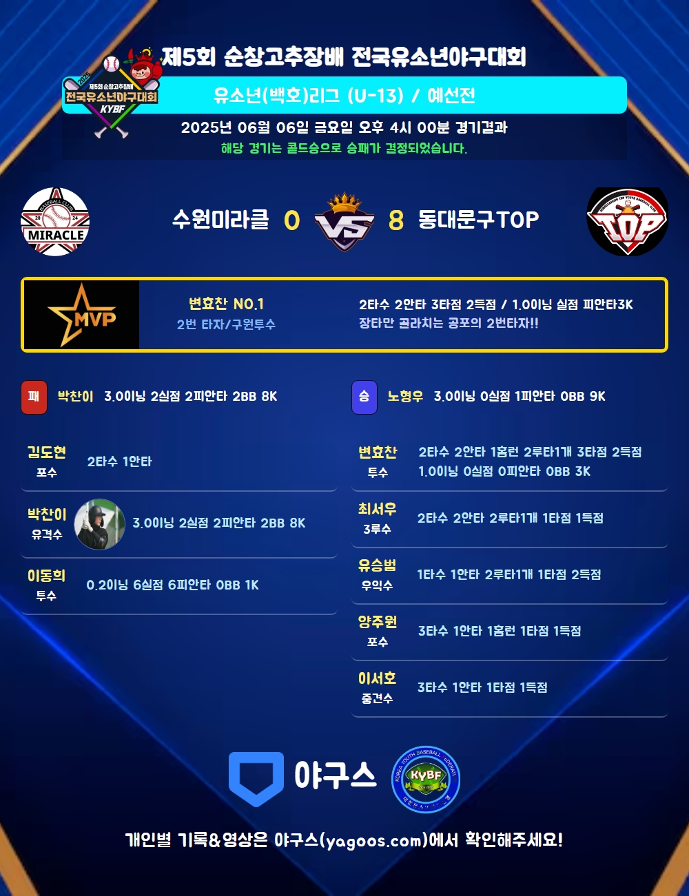 | 1 | 박찬이(36) | 패 | 3.0 | 14 | 11 | 2 | - | 3 | 8 | 51 | 2 | 2 | 6.00 |