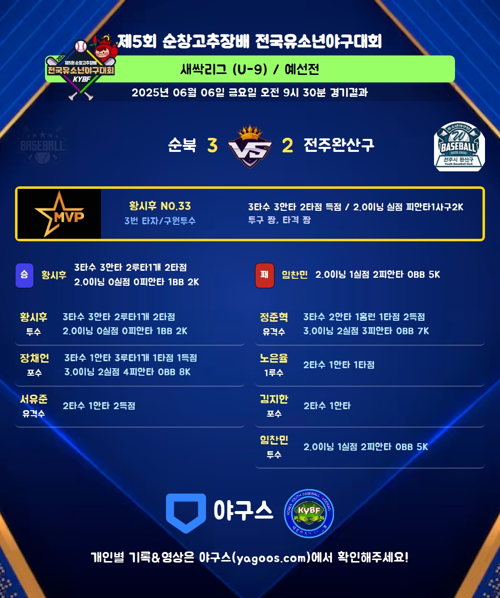 | 2 | 황시후(33) | 승 | 2.0 | 8 | 5 | - | - | 3 | 2 | 36 | - | - | 0 |