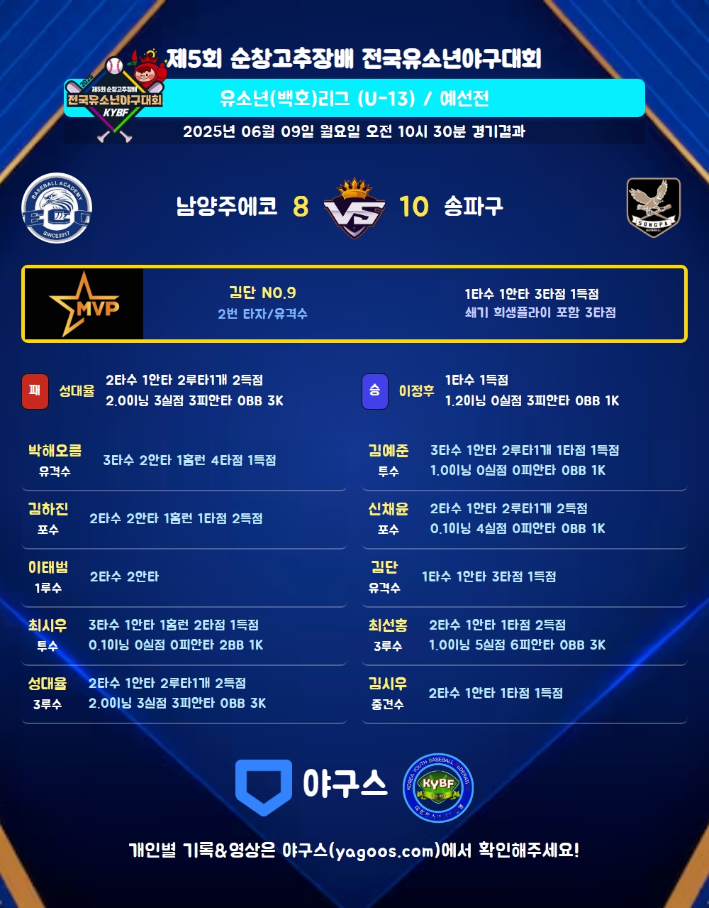 | 9 | 우 | 허태성(25) | 유인플 | - | 유내안 | - | - | 2 | 1 | - | 1 | - | 1 | - | - | 0.500 |