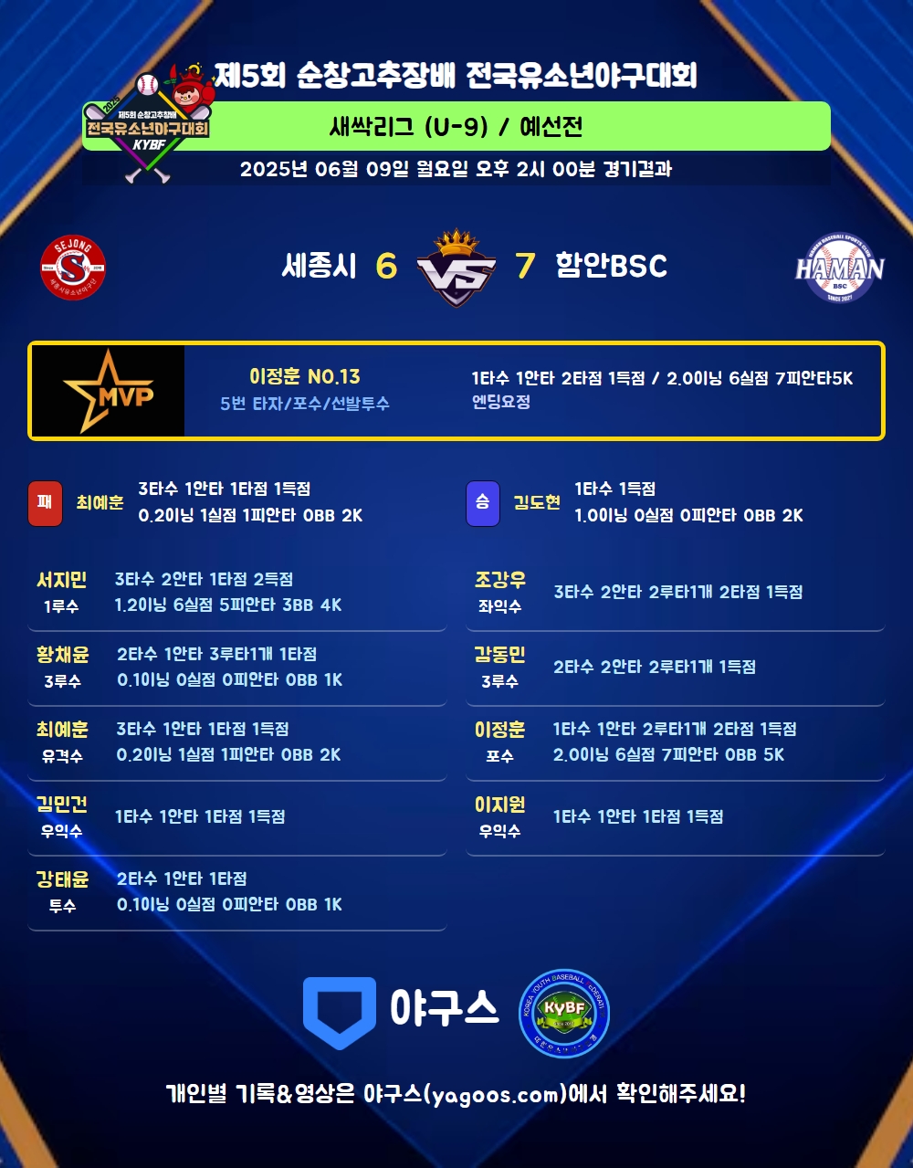 | 함안BSC | 0 | 6 | 1 | 0 | 0 | 7 | 6 | 0 | 10 | 9 |
