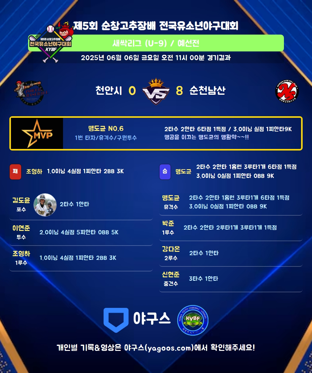 | 1 | 유 | 맹도균(6) | 4구 | 좌중G홈(4타점) | 중전3(2타점) | - | - | 2 | 2 | 6 | 1 | 1 | - | 1 | - | 1.000 |