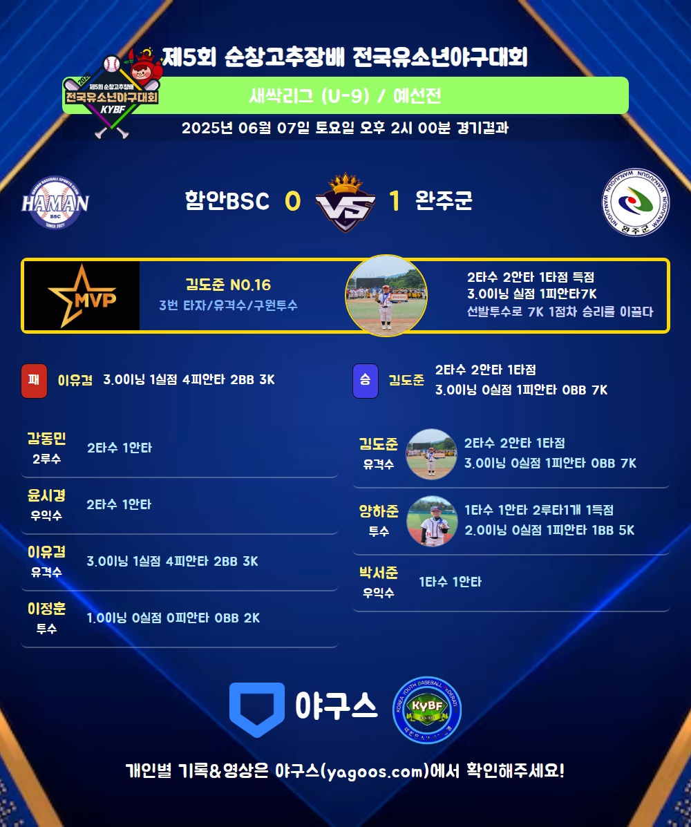 | 1 | 김도준(16) | 승 | 3.0 | 12 | 10 | 1 | - | 2 | 7 | 49 | - | - | 0 |