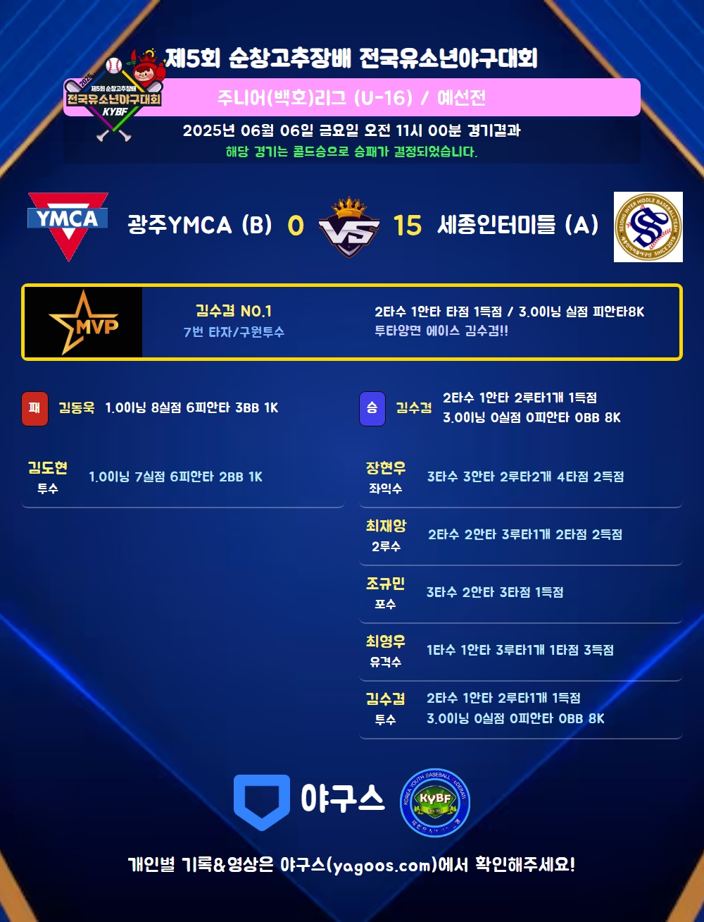 | 1 | 김수겸(1) | 승 | 3.0 | 11 | 10 | - | - | 1 | 8 | 49 | - | - | 0 |