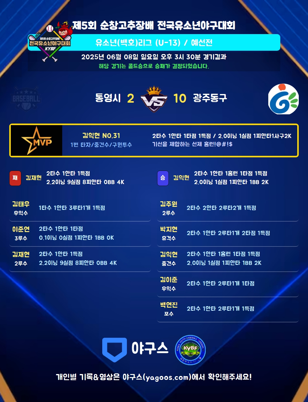 | 2 | 三 | 이준연(1) | 투땅(1타점) | - | 좌안 | - | - | 2 | 1 | 1 | - | - | - | - | - | 0.500 |