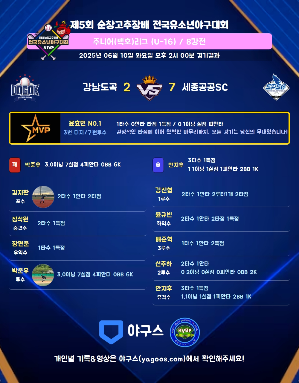 | 7 | 一 | 강전협(8) | 유땅출 | - | 좌중2(2타점) | - | - | - | - | 2 | 1 | 2 | - | - | - | - | - | 0.500 |