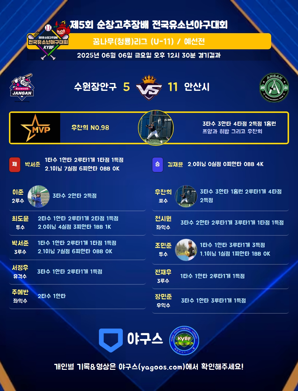 | 2루타 | 서정우(31) 박서준(1) 최도윤(86) 우찬희(98) 전재우(57) 천시원(17) |