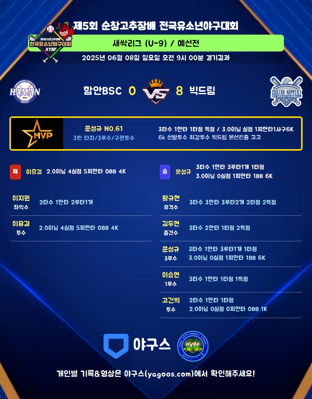 | 함안BSC | 0 | 0 | 0 | 0 | 0 | 0 | 1 | 0 | 2 | 3 |