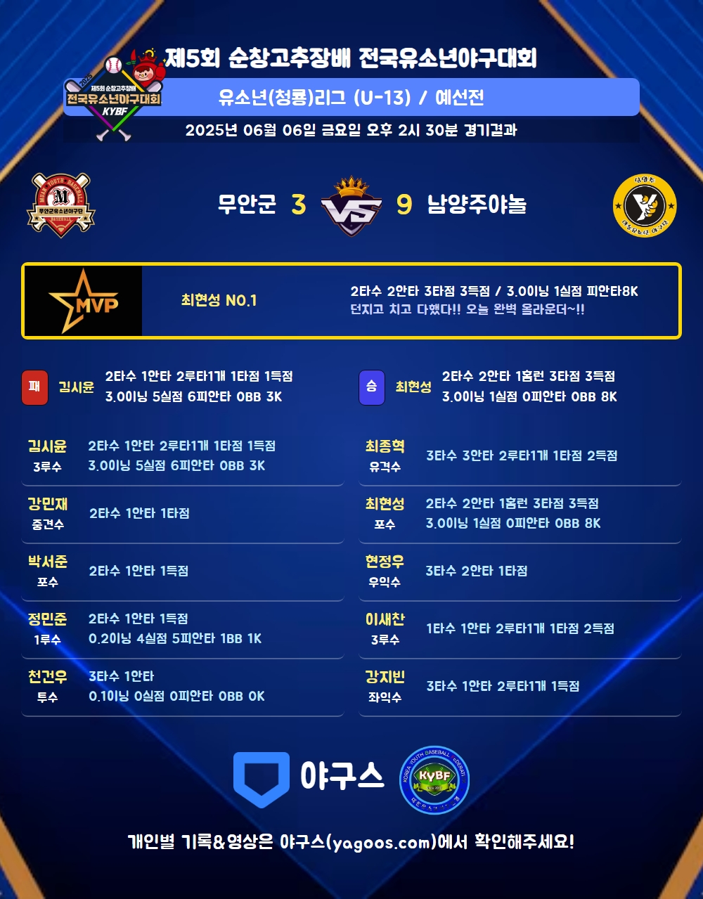 | 2루타 | 김시윤(11) 최종혁(51) 이새찬(47) 강지빈(177) |