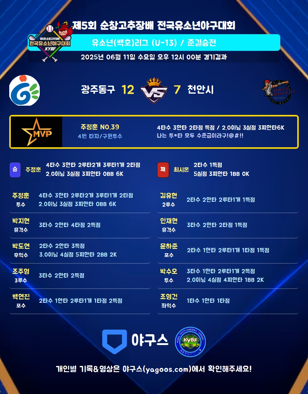 | 2루타 | 주정훈(39) 백연진(2) 박수오(7) 윤하준(1) 김유현(99) |