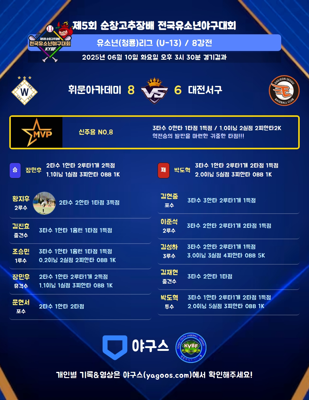 | 3 | 포 | 문현서(1) | 중안(1타점) | - | 유땅(1타점) | - | 4구 | - | 2 | 1 | 2 | - | - | 1 | 1 | - | 0.500 |