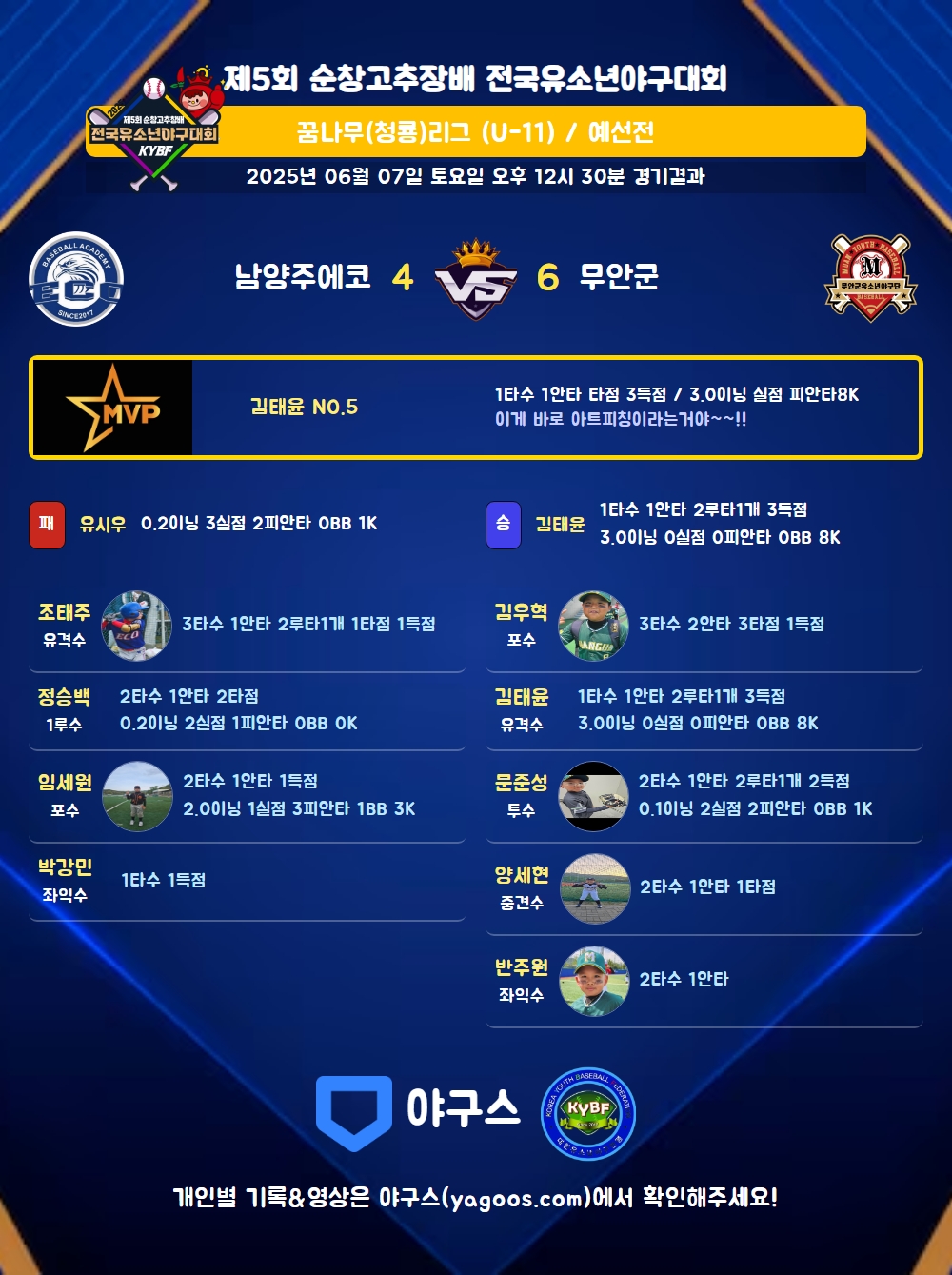 | 1 | 김태윤(5) | 승 | 3.0 | 10 | 9 | - | - | 1 | 8 | 39 | - | - | 0 |