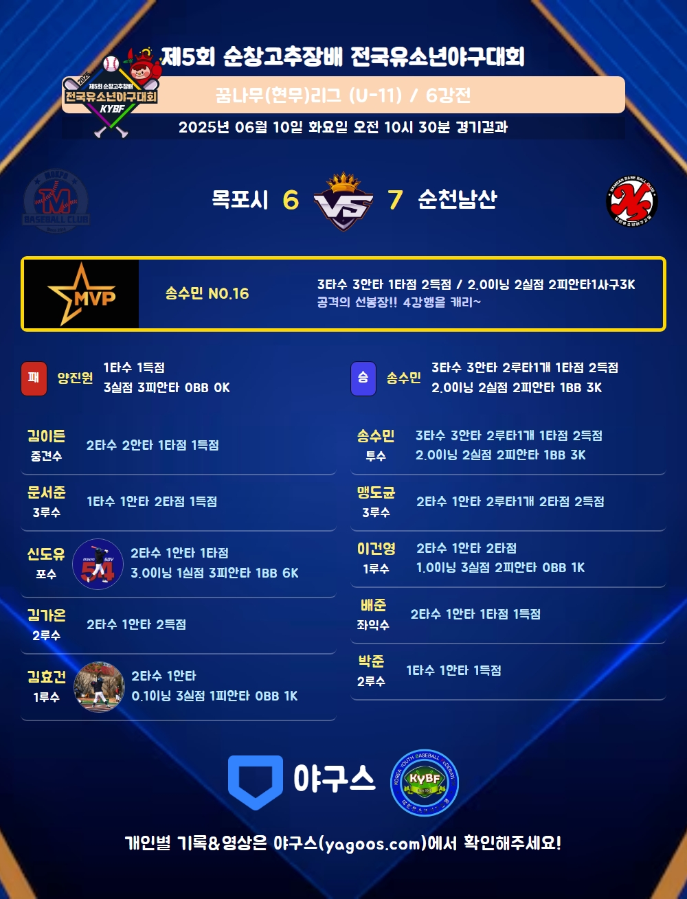 | 3 | 송수민(16) | 승 | 2.0 | 11 | 8 | 2 | - | 3 | 3 | 37 | 2 | 2 | 9.00 |
