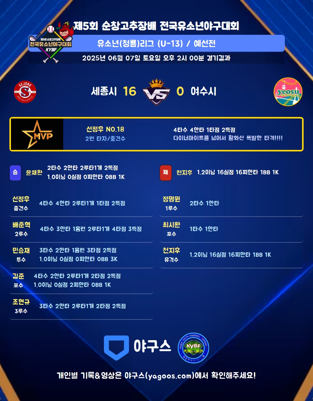 | 2루타 | 배준혁(35) 선정우(18) 김준(30) 이민재(22) 조현규(32) 윤채환(2) |
