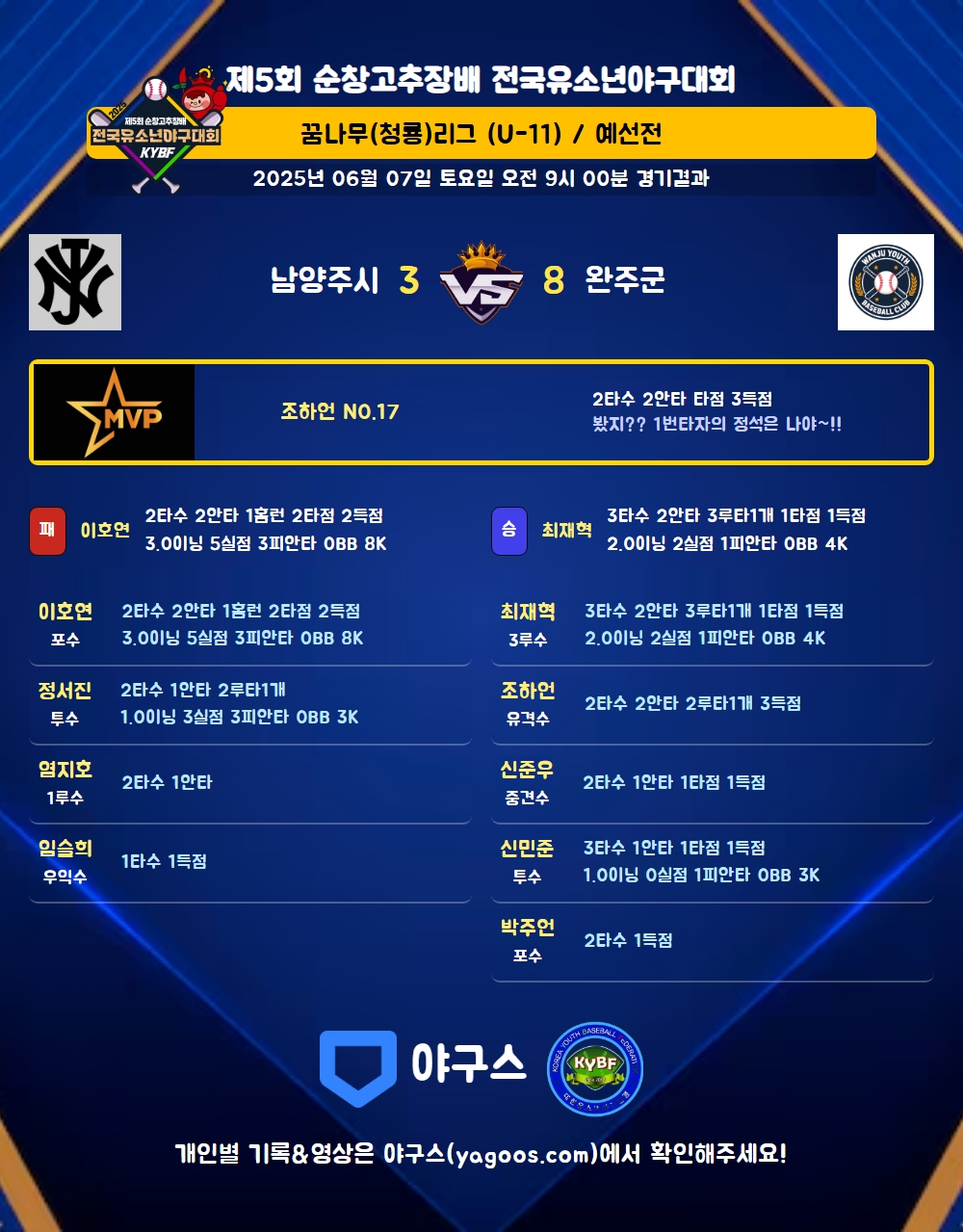 | 3 | 포 | 이호연(9) | 유내안 | - | 좌중홈(2타점) | - | - | 2 | 2 | 2 | 2 | 1 | - | - | - | 1.000 |
