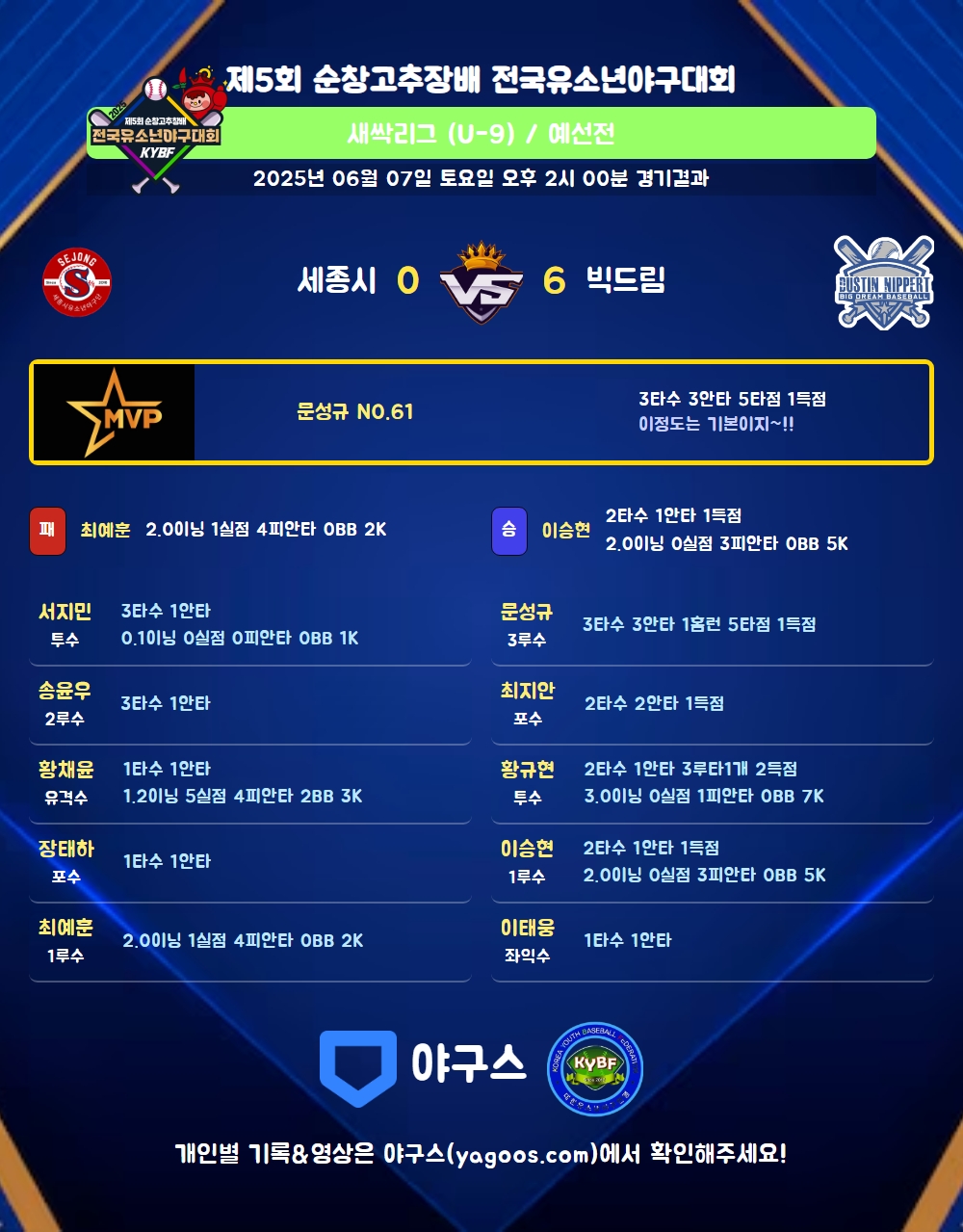 | 9 | 좌 | 민지호(61) | - | 삼진 | - | 삼진 | - | 2 | 0 | - | - | - | - | - | 2 | 0.000 |