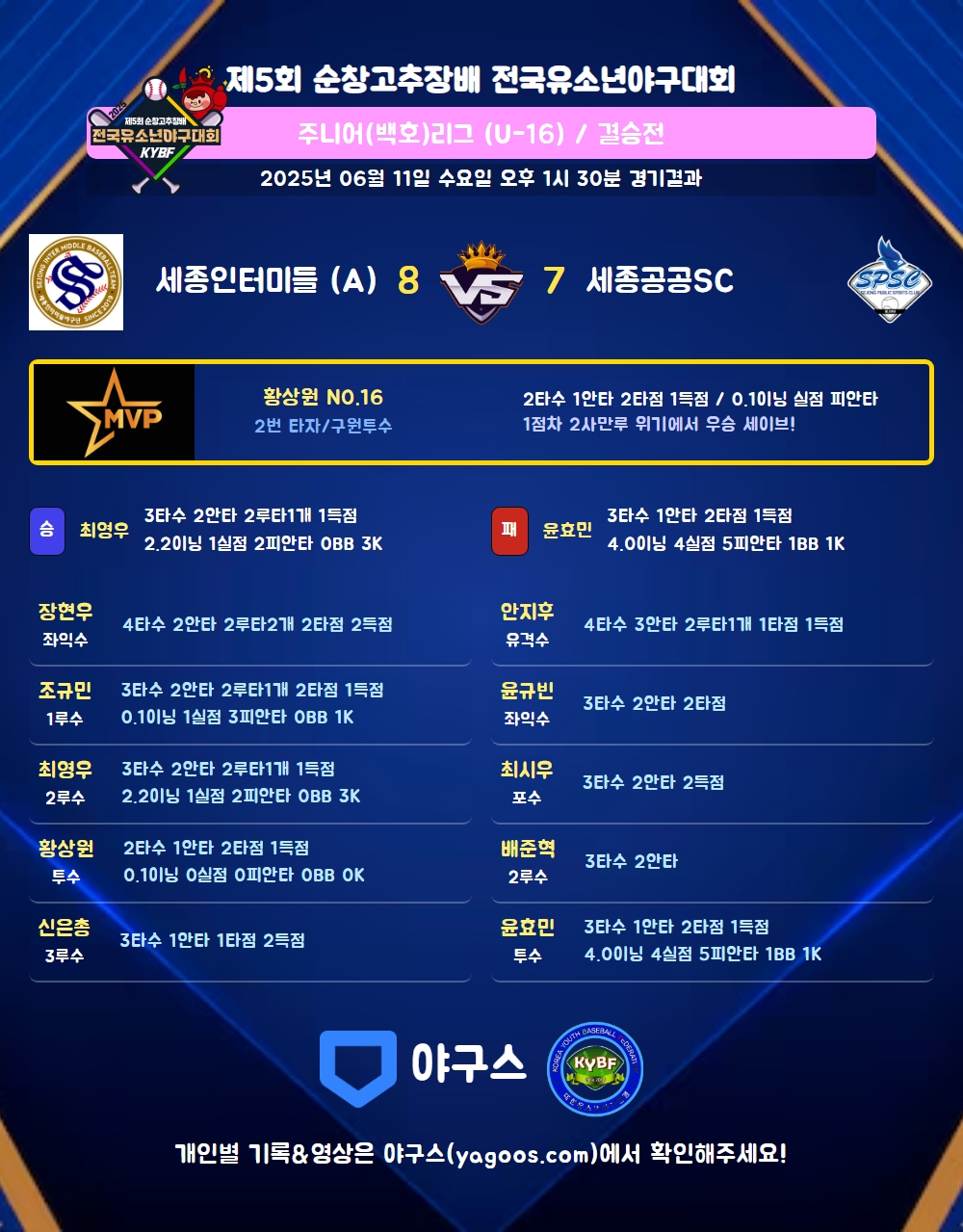 | 3 | 투 | 윤효민(1) | 2땅 | - | 2야선(1타점) | - | 중안 | 4구(1타점) | - | 3 | 1 | 2 | 1 | - | 1 | 1 | - | 0.333 |