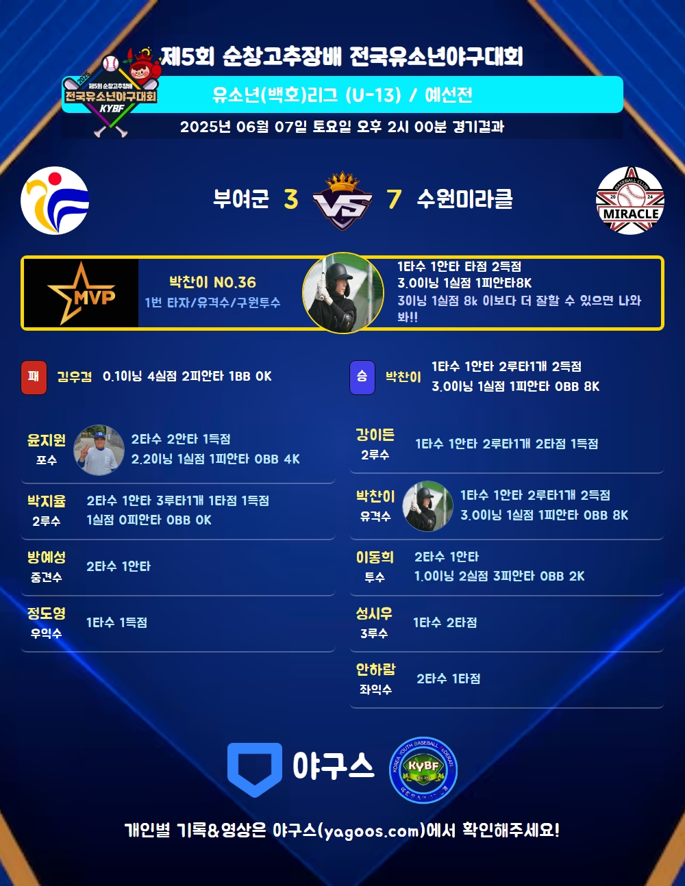 | 1 | 박찬이(36) | 승 | 3.0 | 11 | 11 | 1 | - | - | 8 | 37 | 1 | - | 0 |