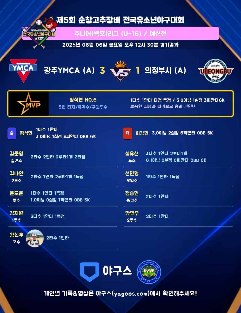 | 광주YMCA (A) | 2 | 0 | 0 | 1 | 0 | 0 | 0 | 3 | 7 | 3 | 6 | 7 |