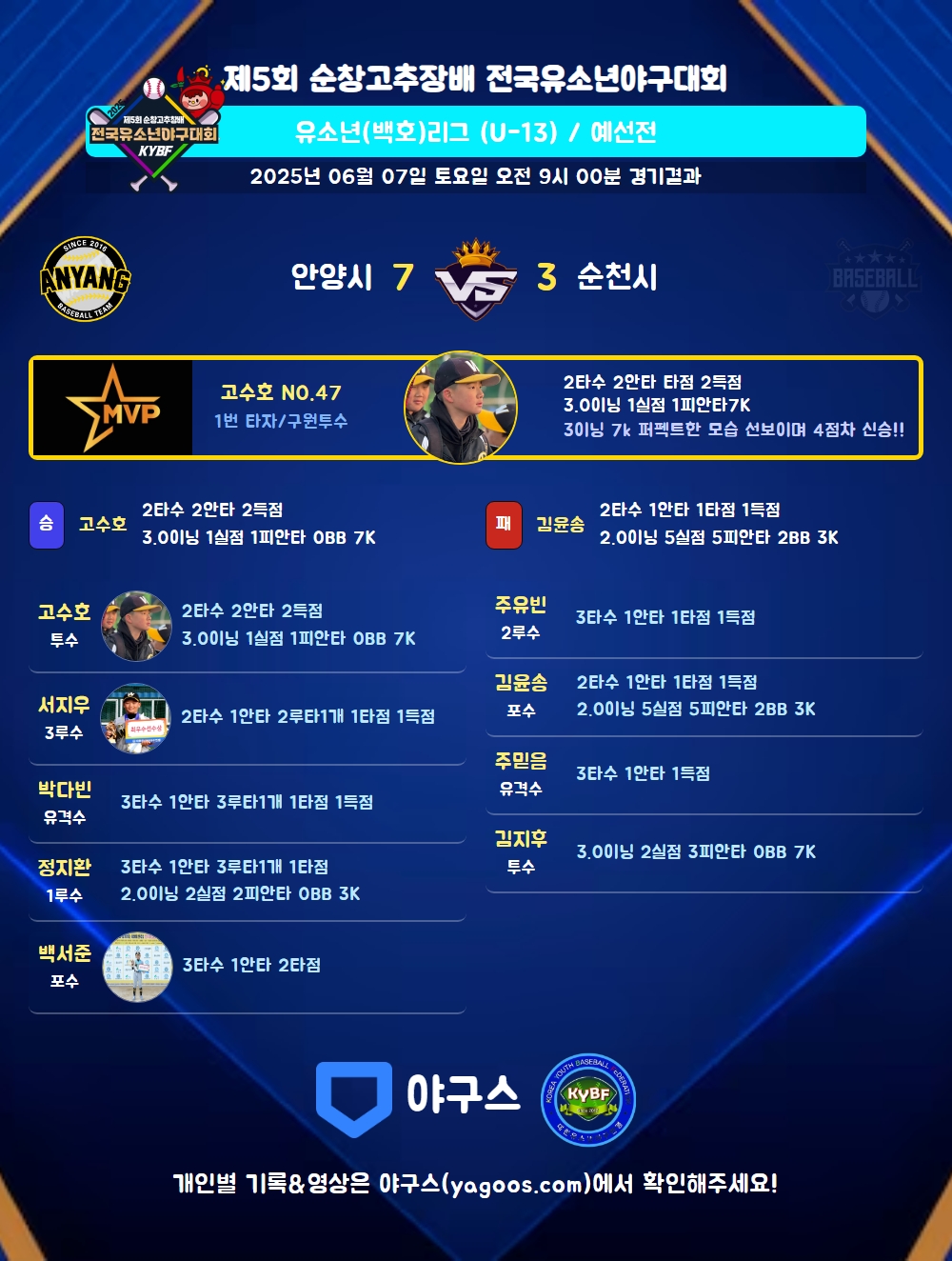 | 4 | 포 | 김윤송(47) | 유땅(1타점) | - | 우중안 | - | - | 2 | 1 | 1 | 1 | - | 1 | - | - | 0.500 |