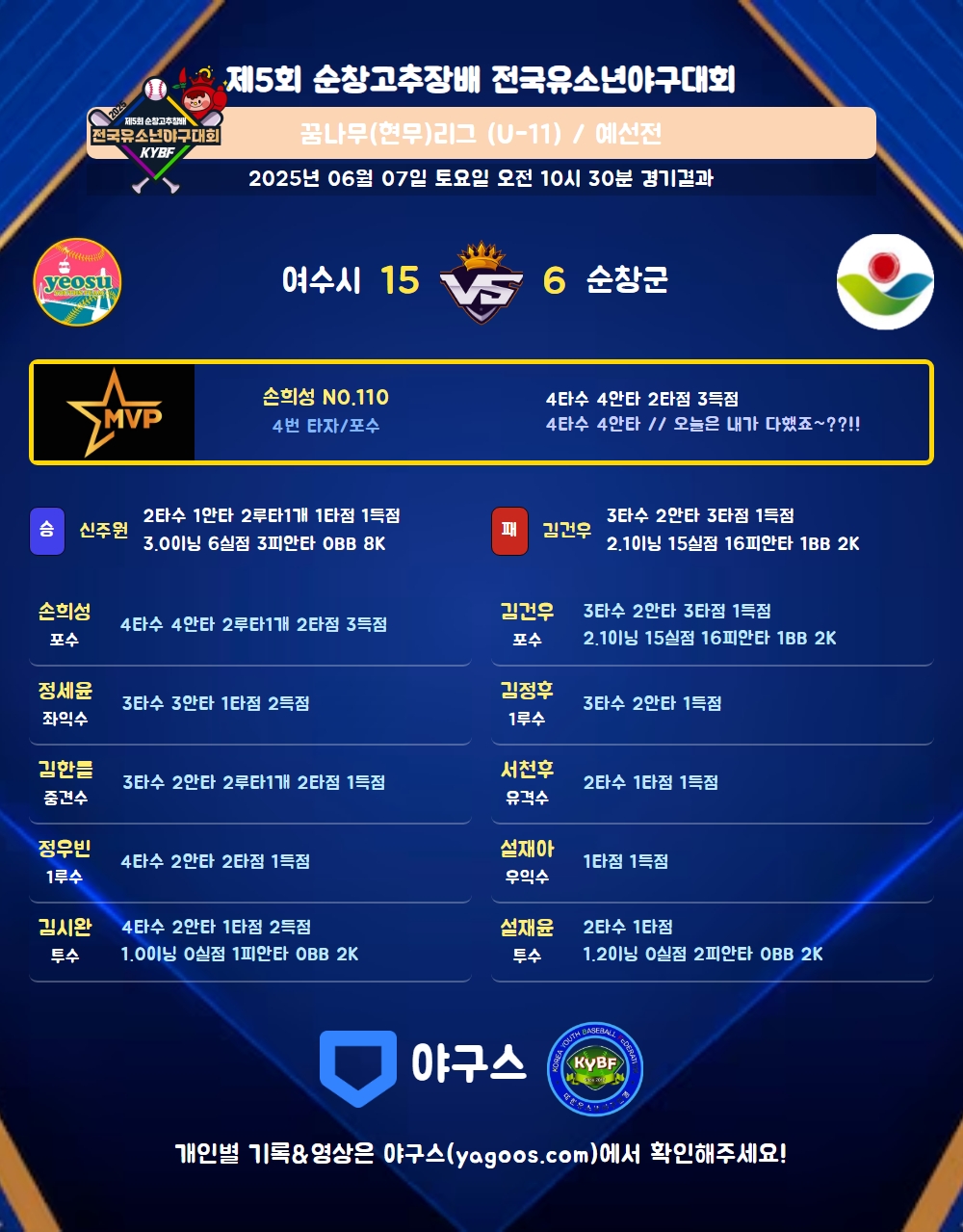 | 4 | 포 | 손희성(110) | 좌선안 | 투내안(1타점) | 2내안(1타점) | 우월2 | - | 4 | 4 | 2 | 3 | - | 3 | - | - | 1.000 |