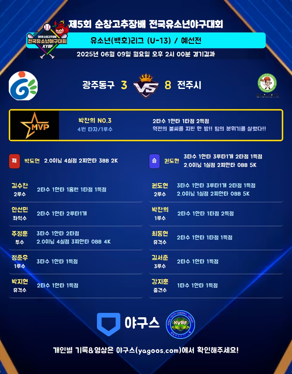 | 3 | 권도현(9) | 승 | 2.0 | 8 | 8 | 2 | 1 | - | 5 | 32 | 1 | 1 | 4.50 |