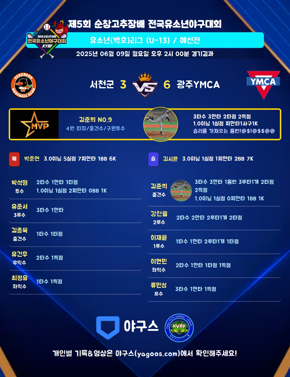 | 3 | 투 | 박석영(16) | 중안(1타점) | - | 삼진 | - | 4구 | 2 | 1 | 1 | - | - | 2 | 1 | 1 | 0.500 |