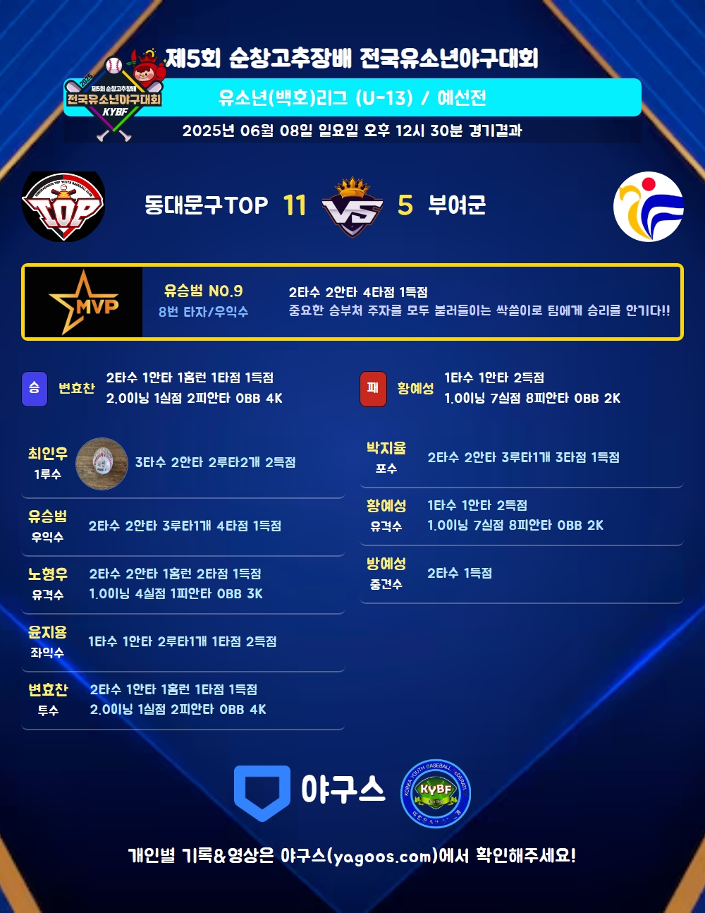 | 2루타 | 최인우(16) 양주원(53) 윤지용(7) |