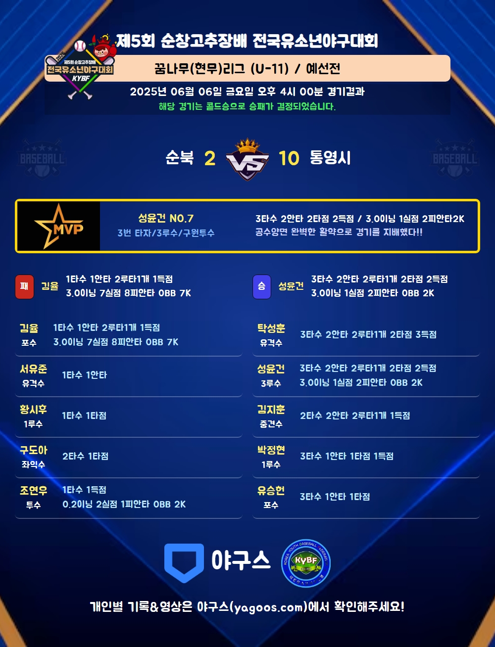 | 2루타 | 김율(3) 탁성훈(19) 성윤건(7) 김지훈(23) |