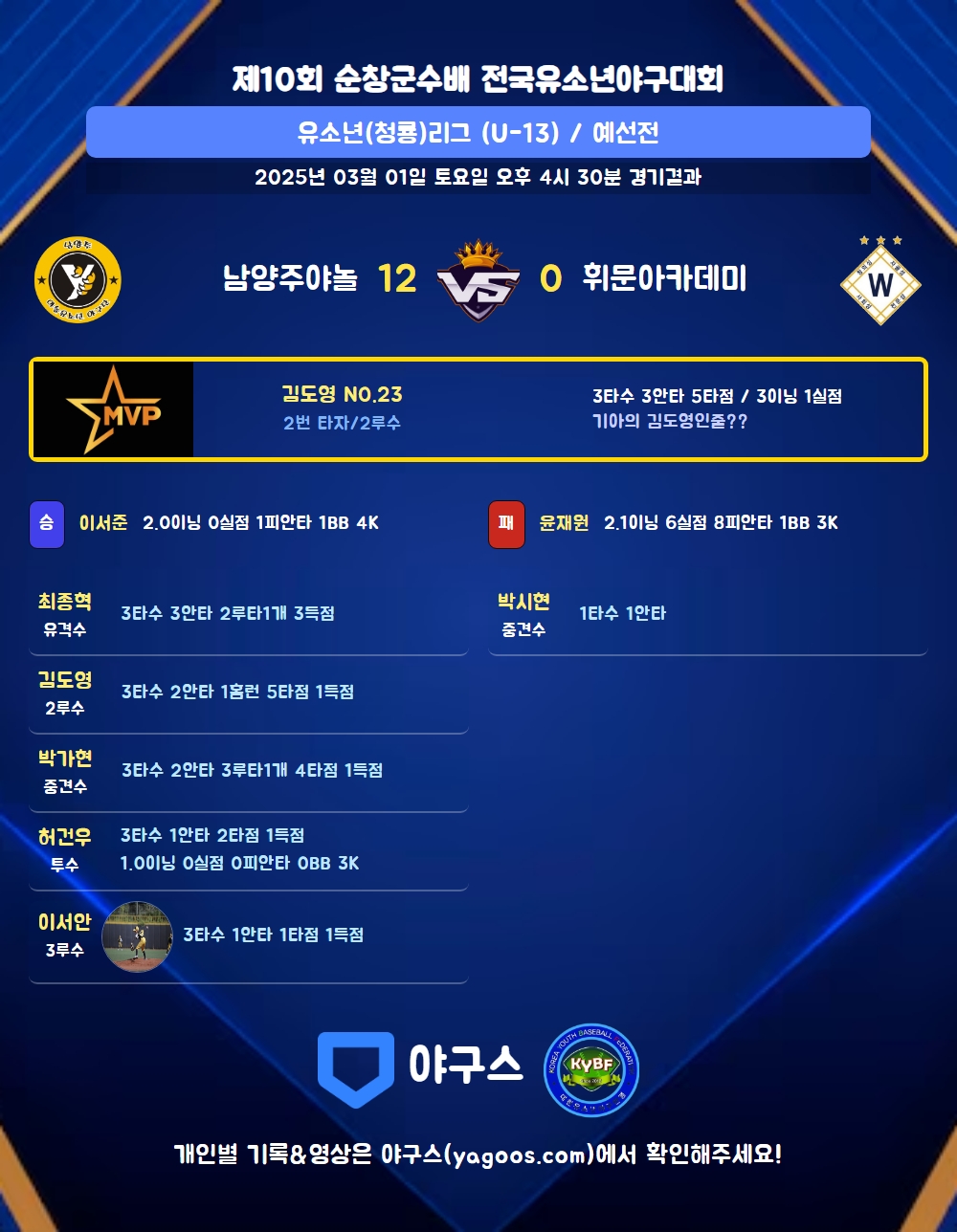 | 남양주야놀 | 1 | 1 | 10 | 0 | 0 | 0 | 12 | 14 | 0 | 5 | 3 |