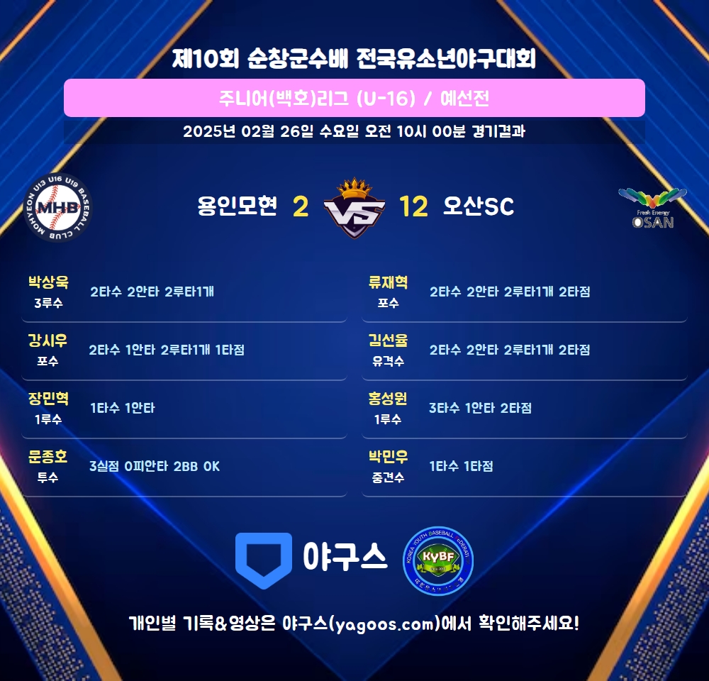 | 2루타 | 박상욱(8) 강시우(38) 류재혁(90) 김선율(12) |