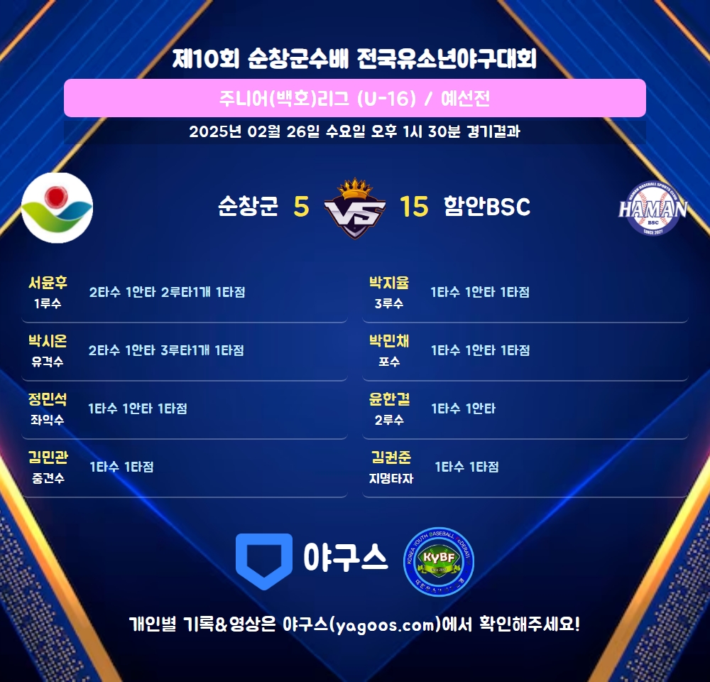 | 함안BSC | 0 | 3 | 0 | 0 | 0 | 0 | 0 | 3 | 3 | 0 | 2 | 1 |