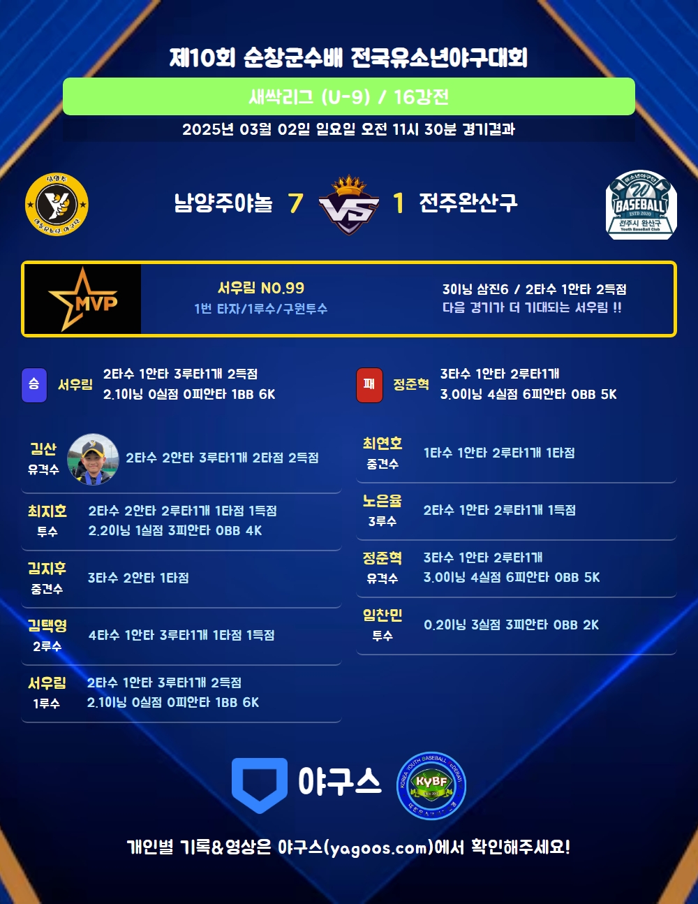| 2루타 | 최지호(9) 정준혁(55) 노은율(1) 최연호(9) |